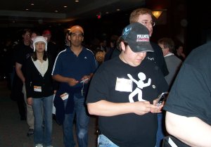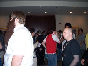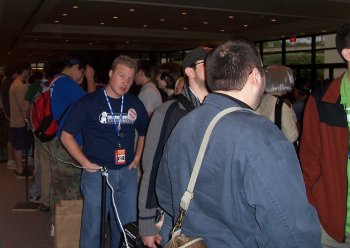 My oh my, aren't they having fun? According to my schedule, they were in line for "Concert." This struck me as odd, considering there weren't any musical acts booked, or at least none worth giving a damn about. Whoever was booked, Nick said he had heard some of their music and suddenly was unhappy his fansub panel was right next door. He'd have to listen to them warming up and sound-checking, and that was apparently unpleasant.