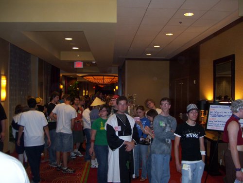 Around this time, and I mean as soon as we walked in, I was greeted by reader Sir Exal. He wasn't in the same fanfic circle as Star and Chromus, so I'm not sure if he was on the suck list, but in any event, he's officially off. Once I had my badge and dropped off my MST booklets, we chatted for a bit about projects that I had almost forgotten about... in particular, the one that necessitated the disclaimer on my "I don't write yaoi... much" line. Thankfully he dwelled on the more redeeming aspects of that particular fic... which only involved yaoi tangentially.
