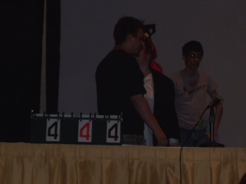 Anyway, it was off to get NTAO ready after that. Besides the friends offering moral support, we were already getting some people a half hour early. Among those people, tech staff were not present. In fact, although my end of the game was all set up, ten minutes before the show the audio equipment hadn't even been brought in. After two calls upstairs, people finally showed up and got us hooked up. In the meantime, we got the first teams up and going- the Mighty Eggplants and yet another incarnation of Team Sea Slugs. "We'll stop using the name when Azumanga becomes less awesome," replied the name's conceiver. In any event, we were all set.