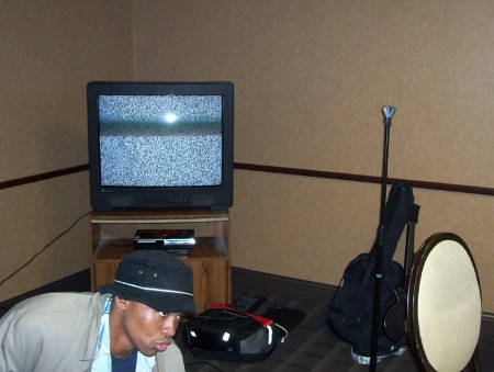 Tony here came in with a nice Rock Band set, which I would have loved to set up had I known anything about setting up Rock Band sets. I managed to get everything out of the bags and neatly arranged so Tony could do the actual set-up when he returned with his A/V cables.
