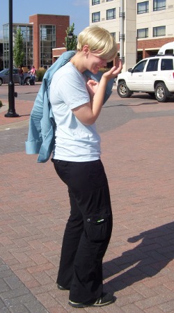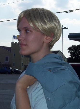 In need of food and with little going on (and no desire to hit the dealer's room immediately), we headed to Perkins. Natalie didn't want to be in full military garb and changed pants, looking disturbingly casual.