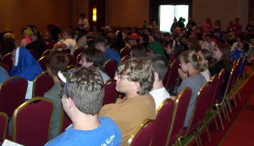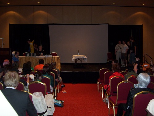 While the other three settled in and got into their cosplay outfits, I was once again tasked with hunting down John before the dealer's room opened. Once again, Name That Anime Opening had the ridiculously awesome time and location- Main Programming an hour before the dealer's room opened. Last year was no problem. This year... no John. Fast Food Anime was set up and rarin' to go, but there was no John. Iowa staffer Jeff was waiting for him too, and all efforts to hunt him down via assorted convention channels failed. Despite that, I did arrange things with the tech staff ahead of time to make sure we would start on time this year. If, that is, we ever found John.