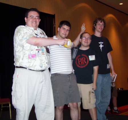 This year, a couple of the defending champion Mighty Eggplants banded together with some fallen comrades last year to form Celestial Being, who totally cleaned house and took the first four rounds. They were so impressive, and helped a little by Winamp skewing a little more old school this year, that the crowd practically turned against them. At one point, I had them retire as champions to get some new blood up there. Then they helped the audience take a round... although later a couple of those guys and I privately lamented that Nadesico needed the audience's help.