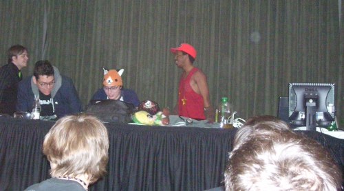 Since Scott was gone and never to be heard from again (I wonder if Swedish dance pop works on wasps too?), I found Mike (the Geek.kon one) and we ran some convention analytics while the lengthy intermission happened. This took the form of a cosplay auction, where young women and men auction their "characters" off for charity. They raised about $600, but the thought of guys spending money on a young girl in a short school uniform is kinda creepy.