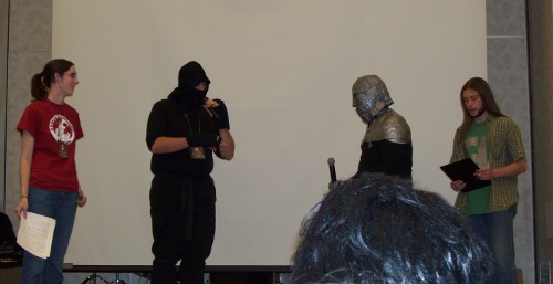 The Bleach video was quite good, setting up for a very competitive contest this year. A pre-title screen announced my video and I quietly went yay. Then the actual video played and it wasn't mine. But it was Otaku No Video so I loudly went yay. That AMV was set to a lovely anthem about geek pride. My video played last and received a mix of wild applause and frightened silence. Perfect.