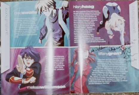 Anime Central '02: "My program, after it was defaced by Tiffany Grant. I was simply holding my program out to see who the hell she was and she grabbed it, asked for my name and signed it. Apparently, she does the voice of Ryoko on Nadesico, Becky on Gunsmith Cats... and I heard somewhere that she had a role on Evangelion, which I should probably watch some time."