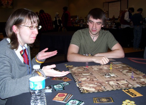 Speaking of studies, the game ended abruptly and Sarah and Evan dragged me to the Tabletop Room. Now, I've been dragged places at conventions, but rarely the Tabletop Room. In fact, this wasn't even to play one of their games: we were playing Harry Potter Clue and Sarah was damn excited about it.