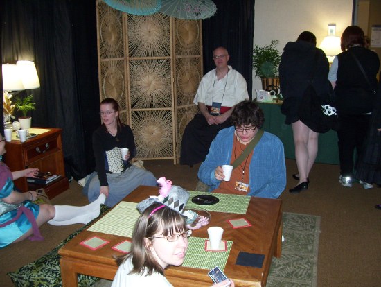 With Mike and Evan running the show upstairs, Sarah and I got a chance to check out a room party hosted by Rae (previous Geek.Kon/No Brand masquerade judge) and company. It was a very elaborate tea party arrangement, akin to the kind of room parties you get at Convergence as I understand it. Made me look forward to that show even more.