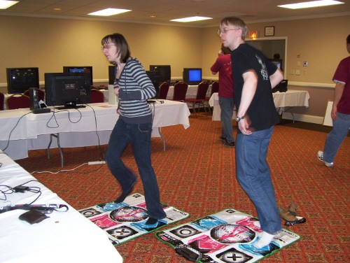 Elsewhere at the con, the big hubbub was setting up the video game room, as it usually is. I ended up helping test out the DDR mats and their positioning on the floor.