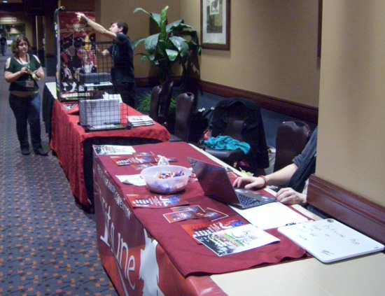 The interim was spent procuring badges and setting up the ambassador's table. We made the executive decision to run the table on auto-pilot for Daisho, since it was only two months after our last con and we didn't have anything to promote outside of our dates and our usual offerings (which most Daisho attendees are already aware of) and pre-registration wasn't up yet. That and our primary road crew were damn sick of spending all their con time cooped up at the table. So we put up a bunch of fliers and our banner, which Simone made sure was folded right and extra-pretty.