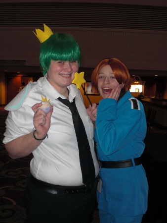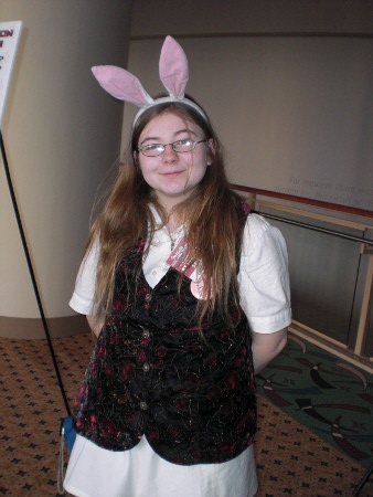 Saturday, I thought I was the only one who didn't have to wake up early in the morning. I was wrong: I had to give badges to day-trippers Sarah B. and Erin. Sarah B. arrived to offer whatever help they needed with their cosplay contest. She ended up as stage manager.