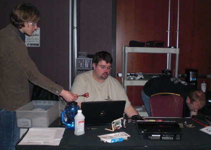 Becker, Red, guy with scissors and our Geek.Kon pixel flier hard at work.