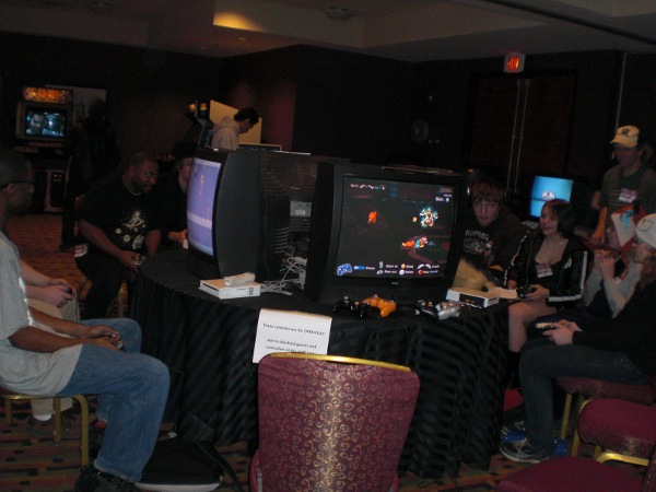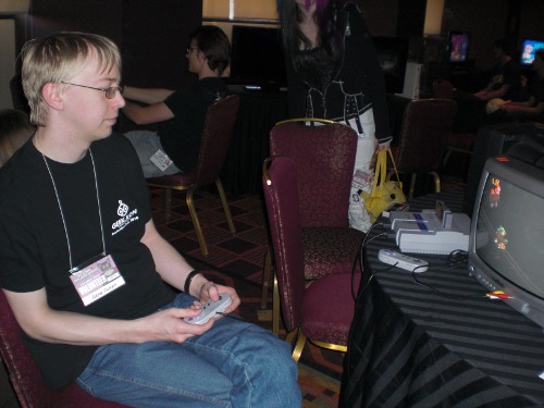 With little to do Saturday night and the rave indeed sucking by all accounts, pretty much everybody decided to get drunk. Apparently, for many, that compels people to want to play Mario at 2:30 am. So while we helped the VG guys clean house a bit, we also ended up having to turn away drunks at the door, often using a firm voice. The real kicker was when we got word that a nearby drunk had committed a crime that shall remain nameless. Josh and Evan went to check it out while I coaxed Mike B. into turning on his rarely seen "security nao plz" voice. Said drunk ended up trying to barge through the closed VG room doors, leaving scrawny ol' me to push back on the door and deny him from charging in and busting up the place... and we have every reason to believe he would have. Josh and Evan tried to pull him off the doors from the other side, only succeeding when Josh subdued him with a takedown move from his military training. Security caught the guy and turned him over to police, but it was a pretty harrowing moment, to the point where I even felt obliged to console their con chair who had to deal with the aftermath of all of it. Even now it's still feels weird typing all that knowing that it really happened.