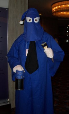 That's right, it's a Happy Happy cultist from EarthBound! Ensuring the happiness of the world by painting everything (including the local cow) blue, these guys make just as much sense as the next organized religion. Sorry Mike, but screw the No Brand Cult- I'm switching to Happy Happy-ism.