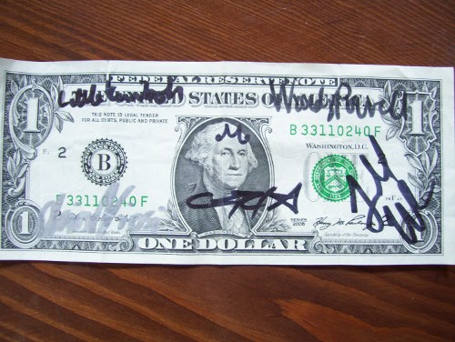 He received this as change- a dollar bill signed by assorted guests from Anime Milwaukee. There's Little Kuriboh, Wendy Powell, Todd Haberkorn, Chris Sabat, and one mystery autograph that logically should be Vic Mignogna but totally isn't. We spent most of lunch playing amateur graphologists to figure out who the hell that is.