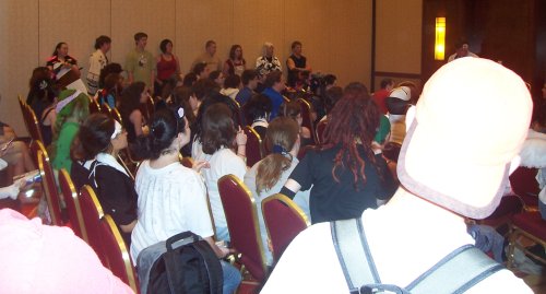 I rejoined my roommates, boasted of my qualification and hinted that maybe they should check me out in the contest (especially fellow Digimon fanatic Tyler). But then it was time to find something else to do. Earlier in the day, John from Fast Food Anime asked if I was willing to help work his booth, citing fears of a staff shortage. I said I would be available to help right about here, but when right about here came he was adequately covered. So I was still looking for something else to do. Perhaps a well-timed panel?