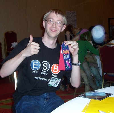By measure of applause, she was the hands-down favorite. I did somewhat better than the Sailor Moon singer, but that was moot as both runners-up got the same prize: a gift certificate for Fast Food Anime (sound familiar?) and a fancy ribbon.