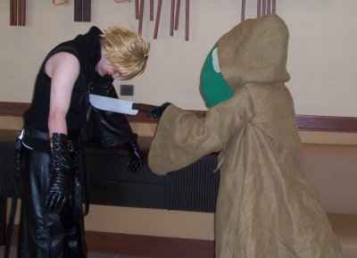 Some hours later, she reached the ATM and got her money (another amusing picture for several passers-by). Cash in pocket, we returned to the dealer's room. As bags were not allowed inside, I checked my bag and she her head (to be retrieved later with the simple request "A bag and a head, please"). Alas, the search proved futile as the stand that had our beloved Kino sold its last copy. We departed, but not empty-handed. Cassie purchased a $20 mystery grab bag, sure to be filled with random goodness.