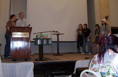 We had penciled in a Saturday night AMV screening, mostly because, as a designated party room, we felt obligated to do something on Saturday night. The party became even more obligatory after the AMV contest, since the many entries effectively prevented Reanna from showing the exhibition videos, including her two new creations. Since they were on my computer anyway, I had announced that I'd show the remainder at my room party.