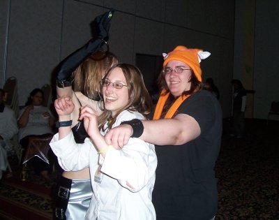 Anyway, the AMV exhibitions were very fun (including one setting "Dance to the Music" to clips from Robot Chicken), but what really made it crazy was the "world premiere" of Reanna's new video- Azumanga Daioh to "The Pussy Song." Easy to picture, hard to execute right. She did. Ri also had a video synching the Japanese opening to Pokémon: Battle Frontier almost perfectly to "Let's Fighting Love" from South Park.