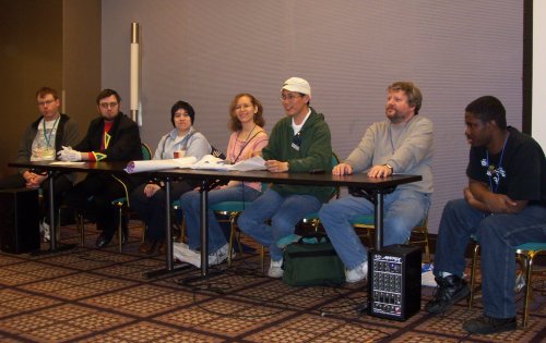 With his duties temporarily over, he got a chance to check out the dealer's room for the first time. We didn't see much of anything interesting, and my newly-acquired cold was depleting my energy levels. A hot dog from concessions didn't help, so it was off to find a place to sit down and relax before the fanfic panel. He was off to get ready for the fansub panel, hoping Greg Ayres wouldn't come in with other guests and arrange a formal protest. Apparently, Ayres noticed the panel this year (strange as there's been one for as long as I remember) and raised a big stink with the ACen staff. That must have been a fun day for the Guest Relations department.