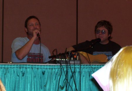 The Q&J panel- Quentin Flynn and Jeff Nimoy take on all questions, whether or not they have anything to do with anime (boxers or briefs came up more than once). As Jeff (left) voiced Wolfwood and Quentin did Reno in Advent Children and a couple Kingdom Hearts characters, they were popular with the fangirls, leading them do write and perform a song about yaoi... or lack thereof in their case. Plenty of Digimon discussion, particularly with season five (Quentin voices Marcus and yes, Jeff gave us all his Tentomon voice), but thankfully none of it was near the frequent yaoi discussion.