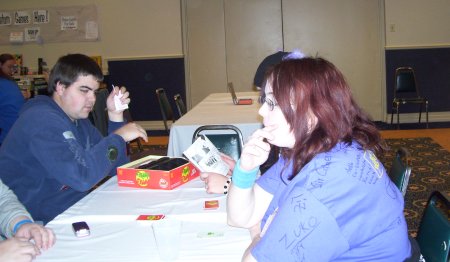At this point... well, I really wish I remembered to take pictures of Saturday night's room party because it was bigger and better than Friday's. I turned on my party mix, led it off with Sakura Kiss from Ouran and away we went. Harley brought in Goldeneye on N64 and more Faygo 3-liters than we would ever drink (I drank more of it writing this recap from home than I did at the party). Even Cheesus graced the room with an appearance and us two vets got to trade war stories and decide who wanted to start the inevitable dance-related flame war on the forums the next day. People came in and out, we didn't get any angry knocks from John or the night manager, and much anime was discussed. We lasted until about 3:30, when it was dwindled down to me, Nick and Sarah. I escorted Sarah back to her room and Saturday ended as a rousing success, dance be damned. And judging by the dance-related flame war on the forums the next day, it will be.