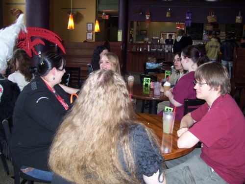 After that came a shower, a romp through the dealer's room (Fumoffu! Another series I'll never get around to watching!) and a visit to the cool corner with Theresa and Chris. The cool corner was a side entrance that was locked for the con, providing a nice little area for hallway socializing that didn't create a blockade. Its name was a bit misleading; I thought it was more of a cul-de-sac. "It is quite cul-de-sactic," agreed Chris.