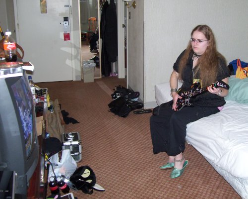 So Jas, Theresa and I went up to play Guitar Hero for the rest of the afternoon, using Jasmine's Hello Kitty guitar. We burned through most of the 80's on career mode.