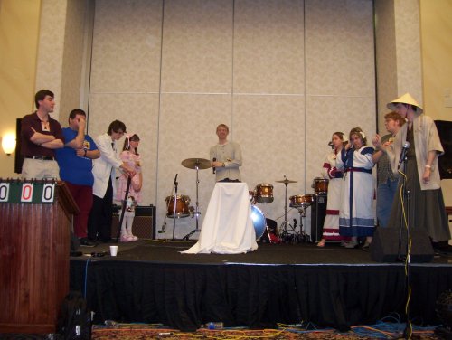 Yep, Scott was back again portraying Li'l Cuthy Himself. Unfortunately, one improvement we made this year relied on fewer songs from my own collection so Scott's advantage disappeared and the Elder Gods were vanquished. After Team Uta fell to the SOS Brigade, Richard jumped as part of the Sea Slugs. Despite Richard dominating last year's test run at Chaoticon, he lost here, as did the Spanish Inquisition, which takes the award for best team name. As SOS had it clinched, we invited Team Uta up for a rematch. They used their second chance to come back from a 4-2 deficit and salvage a win with Wolf's Rain. Chromus, you'll be happy to know that not only did Kaleido Star come up, but two players grabbed the tape simultaneously to answer it. Only one of them got it right, but still...