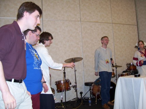 My first move was to pace around the room, analyzing the various tables and stands we had available and how much we'd have to pay if we knocked over the cymbals. Keep in mind that this was right in the middle of Johnny Yong Bosch's Bleach panel. I'm sure he was thrilled. Tyler and I managed to find a couple staffers willing to move the drums against the back wall so we'd at least have a modest arena. Although we did end up using an equipment case as the podium holding the Official Name That Anime Opening Roll of Duct Tape.