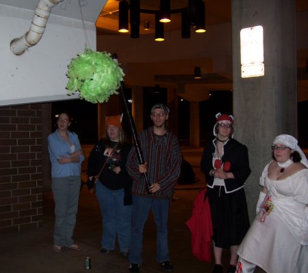 Despite the sugar rush, once the piņata was destroyed, the convention seemed to stop. Everybody quietly retreated to their rooms, the video games or the elevator, leaving anyone who wasn't interested in sleeping, gaming, or violating fire codes with nothing to do. I resorted to many things, including Neil's late-night panel of random videos (including his infamous Grave of the Fireflies video). Eventually, I gave up and slept. I did have a writing panel the next day.