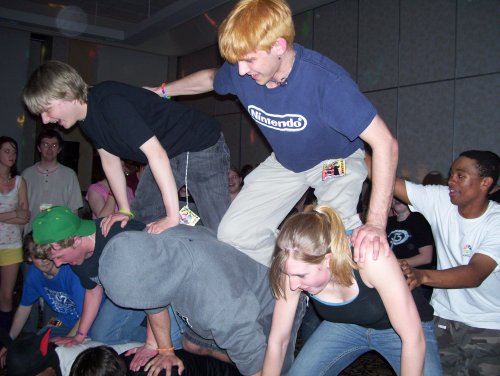 It did in due time. Here, a sweet Mario remix leads a group to make a human pyramid. I didn't understand the connection, unless somebody was planning to jump over them towards a human flagpole that hadn't been constructed yet.