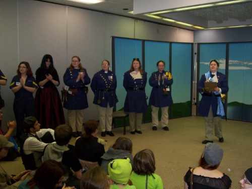 The AMV Contest... um, yeah. Factor in the delay and the move into an anime viewing room (sorry if you wanted to see Outlaw Star, folks) and the whole thing was a fiasco. The audio in the room was something of an afterthought as the projection speakers didn't project (and one video set its sound level to "barely audible"). The projector's video had a funny tint, as if the red forgot to show up for work. And the judging could be described as anywhere from misguided to "holy crap, have you ever watched an AMV before?" The winner was obvious: that awesome Beck video that took Best in Show at Detour. It was the second and third place videos that got WTF looks. One was a ho-hum action video that never really evoked any emotion. I'd give that the benefit of the doubt, but the third place video was so pixellated that Nick F. and I were in the back shuddering at it, barely able to discern what the hell the video was actually about. There were several better videos in that contest and with judging like that, I'm glad I didn't submit anything. It's joining Anime Iowa on the blacklist until further notice.