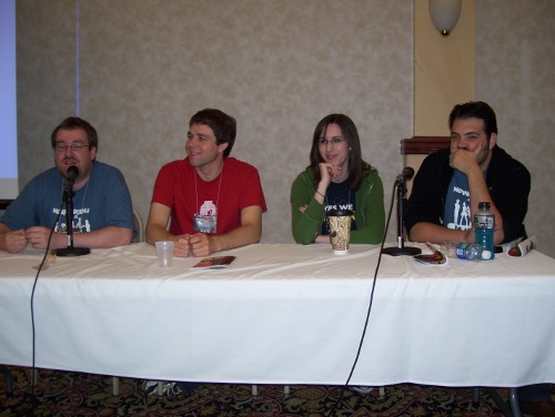 We got back in time for Evan's shift, with enough time to spare to hang out with Kenny, Sarah B. and a few other folks that happened to be Geek.Kon staffers. We weren't having a staff meeting that day, but noticed that since Kenny and Sarah were our treasurer and secretary, we technically had a quorum.