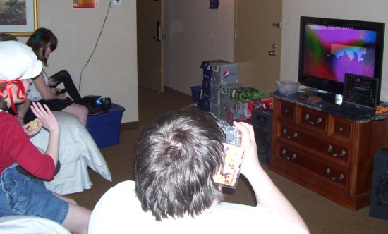 While I attempted to get some video games in, I ended up spending more time in the tabletop room as Mike subjected himself to an Apples to Apples game- a rare sight as he usually tries to get less mainstream games like Ascension going. That ended up being really cool as he got me into a manic building game called Hecha (it's like Catan played as an RTS instead of turn-based) and I countered with the Back to the Future card game. Sarah B. also brought Let's Kill, a game created by perennial Geek.Kon guest Aaron Pavao. It is fun and you should buy it now.