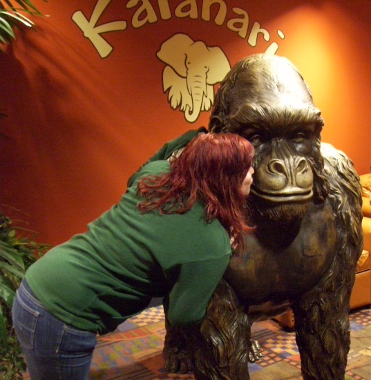 Simone enjoying the statues around the Kalahari post-dinner. We went to the on-site sports bar and ate way too much.