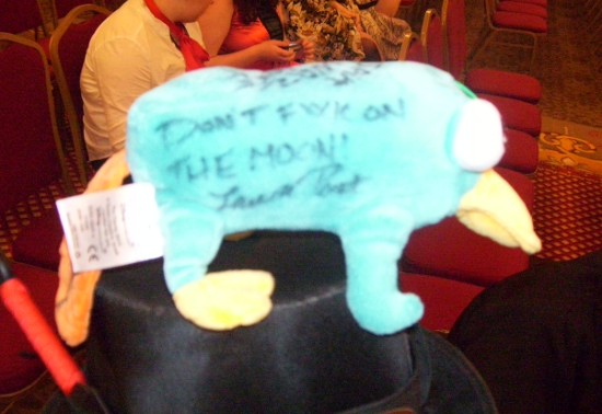 Somebody bought a Perry plushie in the vendor room the next day and made all the panelists sign him. We were all unanimously disgusted and impressed by this. I signed his smooth, soft underbelly.