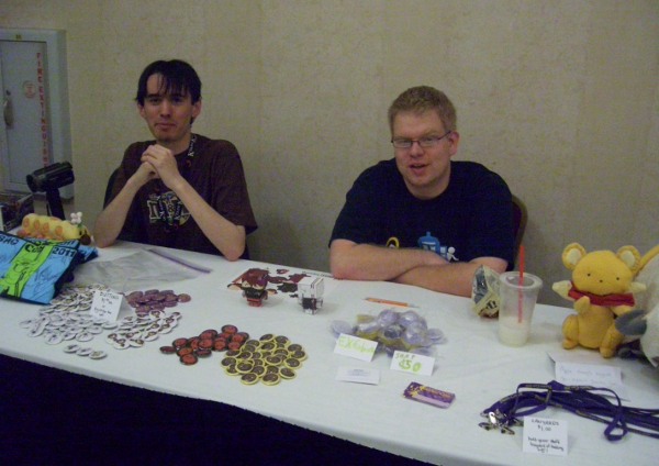 Since Scott had already left and Matt had some panels he wanted to check out, I was riding solo at the table for most of Sunday. Since I was still wearing my staff shirt and staff badge, people were often under the impression that I was staff. When somebody turned in a lost-and-found item, I had to follow due process and take it to the right people. I asked if someone at the Daisho table could watch our stuff while I was gone.